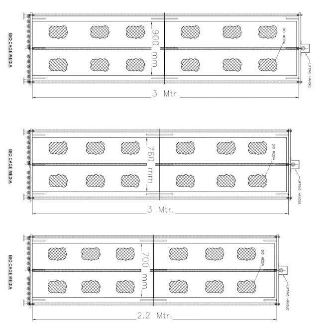 The lightweight, modular bio-media and support assemblies are designed for easy installation in both new and existing treatment tanks. Within the basin, the media cage towers are strategically arranged to create a plug-flow hydraulic pattern, promoting uniform treatment and eliminating the need for traditional baffles. This efficient configuration enhances contact time, reduces dead zones, and improves overall system performance.
